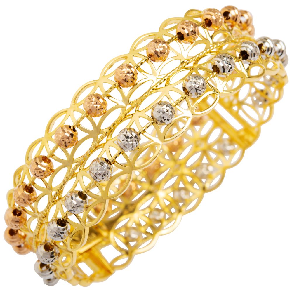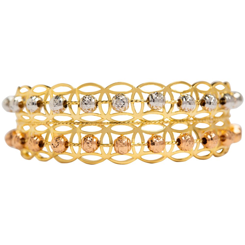 Sản phẩm nằm trong bộ Sưu tập Vòng tay Sweet Lady, mang hình ảnh các quý cô thế hệ mới với phong thái ngọt ngào, tự tin và chân thật. Chất liệu vàng 18k phủ màu hồng, xám, vàng tạo độ tương phản độc đáo. Tổ hợp hạt châu được chạm khắc chuẩn xác, trải đều trên dãy lưới mảnh mai, tinh tế, đem đến vẻ nữ tính, nhẹ nhàng nhưng không kém phần nổi bật, phù hợp trong các buổi dạo phố hay tiệc nhẹ.